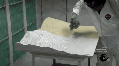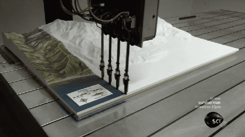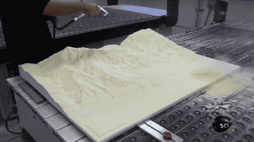 實物的地形模型,使用的材料是耐用又輕巧的聚氨酯泡沫。通過計算機(jī),把「數(shù)字地形模型」的數(shù)據(jù)連到精雕機(jī)上,高速自轉(zhuǎn)的鉆頭在泡沫上移動,這就是它的切削方式了。hsD中國模型網(wǎng)