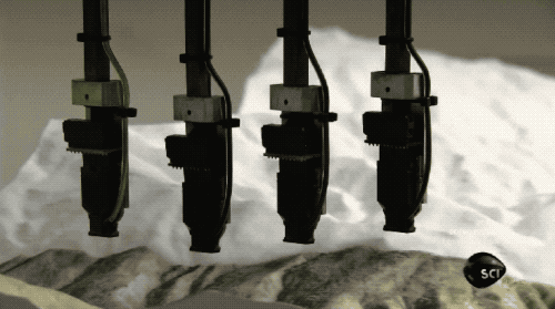 接下來,就要噴上彩墨了。這里使用的噴涂裝置是改裝過的立體噴墨打印機(jī)和普通四色噴墨打印機(jī)不同的是,它的噴頭被改裝成能動態(tài)貼合地形模型的表面。hsD中國模型網(wǎng)